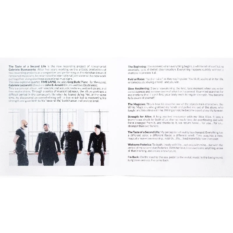 The Taste of A Second Life, è il nuovo progetto discografico del Sassofonista Gabriele Buonasorte che, dopo 5 anni che lo hanno visto impegnato nella produzione artistica di due importanti progetti discografici della scena pop cantautorale, e come sideman di importanti musicisti, torna con un nuovo lavoro a suo nome sulla scena jazz internazionale, e lo fa al fianco di tre musicisti eccezionali. Una band esplosiva compone infatti questo nuovo quartetto, i TIME-LAPSE, Greg Burk (Piano – Sinthesizers), Gabriele Lazzarotti (Bass) e John B. Arnold (Drum and Live electronics).